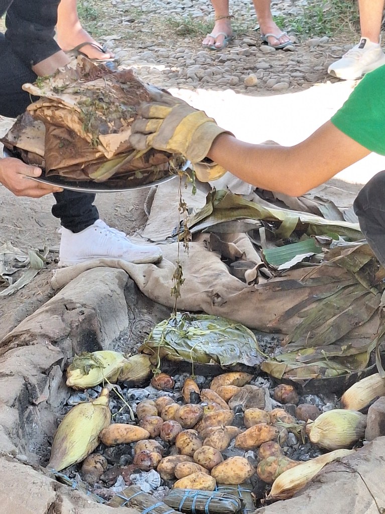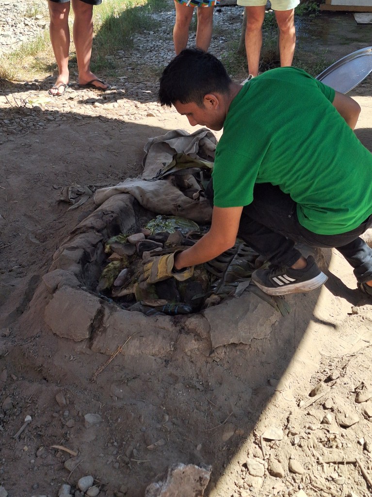 To prepare, they put a bed of heated rocks, then potato, corn, cheese, beans and on top is meat. Cover with herbs or banana leafs. Then a blanket and lastly covered in earth.