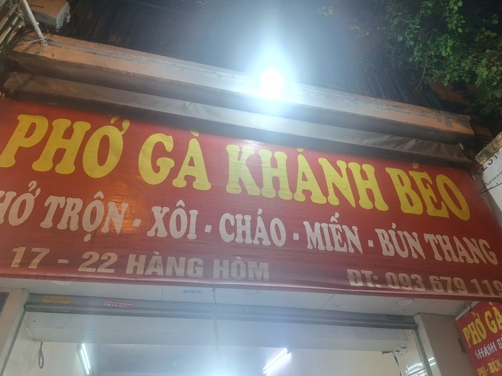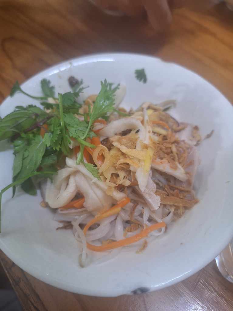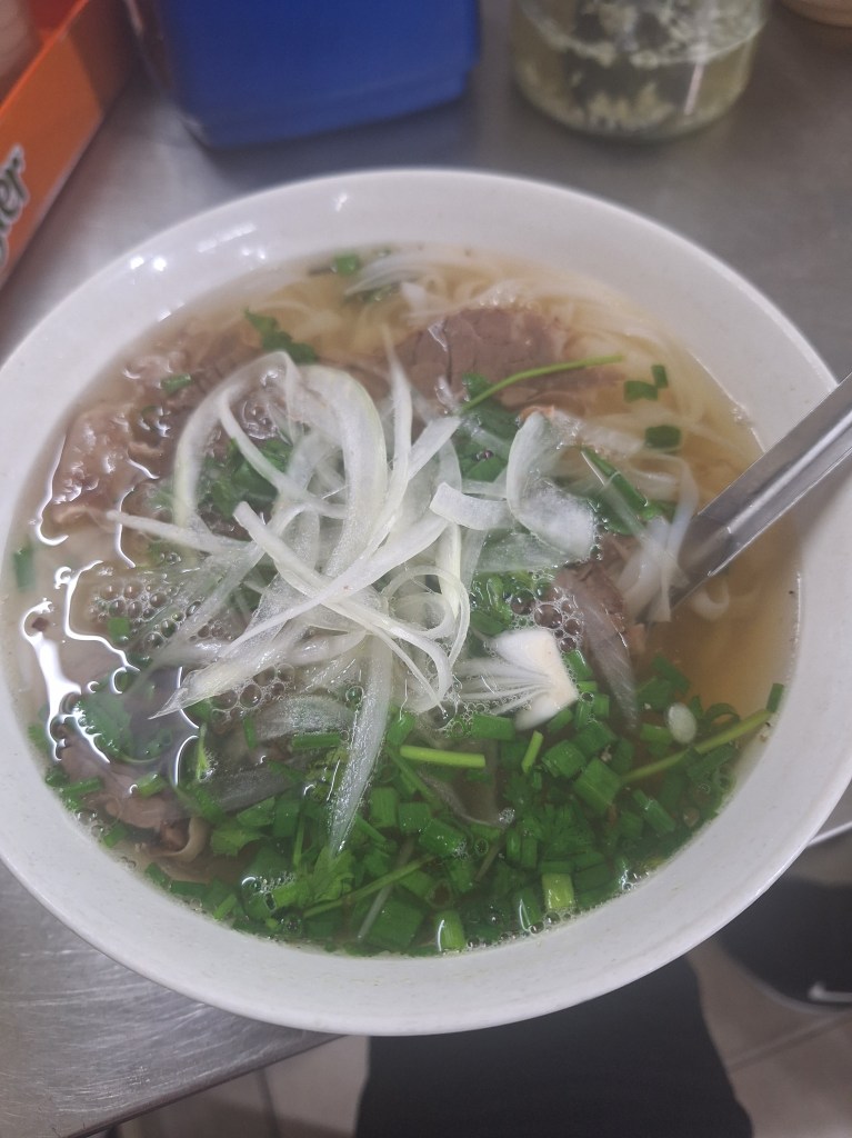 Pho – a Vietnamese soup dish consisting of broth, rice noodles, herbs, and meat (usually beef, sometimes chicken). It was tradionally served at breakfast but now all day for tourists.