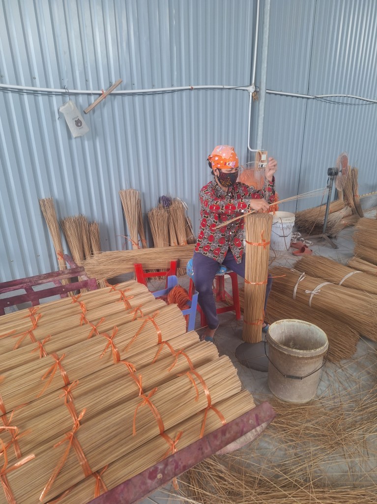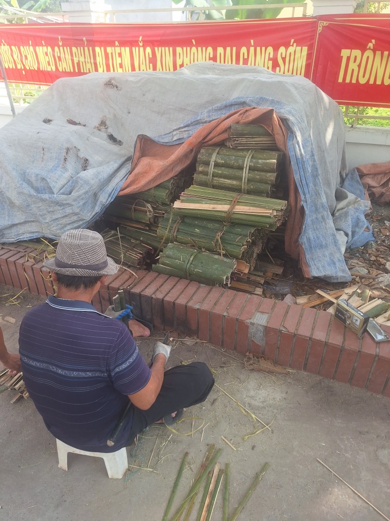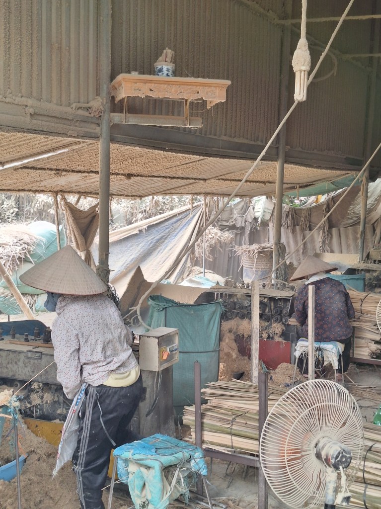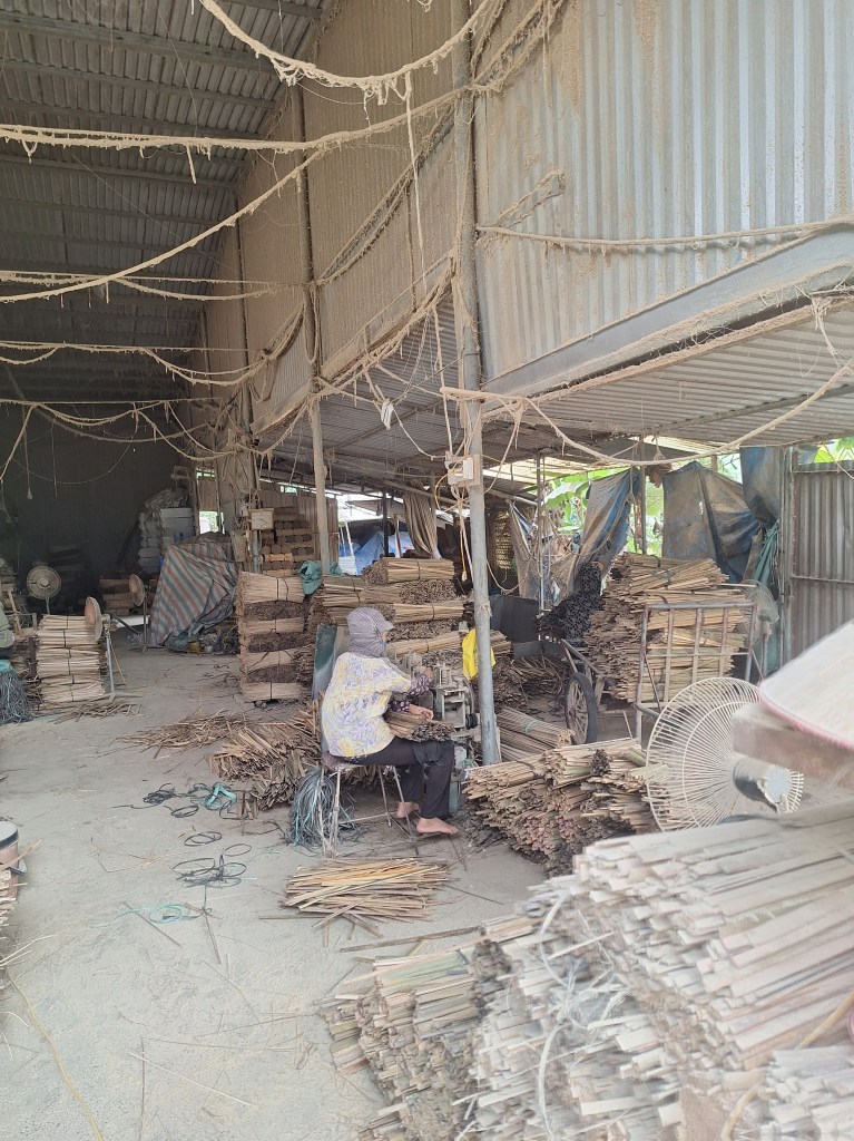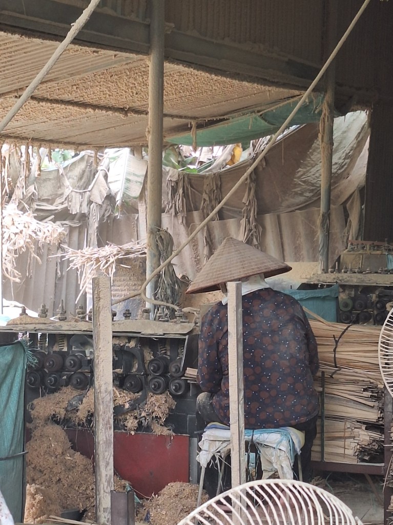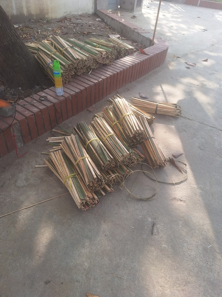 The bamboo to make the incense is brought from central Vietnam. Tonnes a day! The first part of the process is to soak the bamboo in muddy water. This can happen for up to 3 months. The reason they do this is to change the smell of the bamboo and remove any insect or future ones being attracted to it. Once they are dried, they will cut them into smaller pieces by hand, removing the green outer layer.