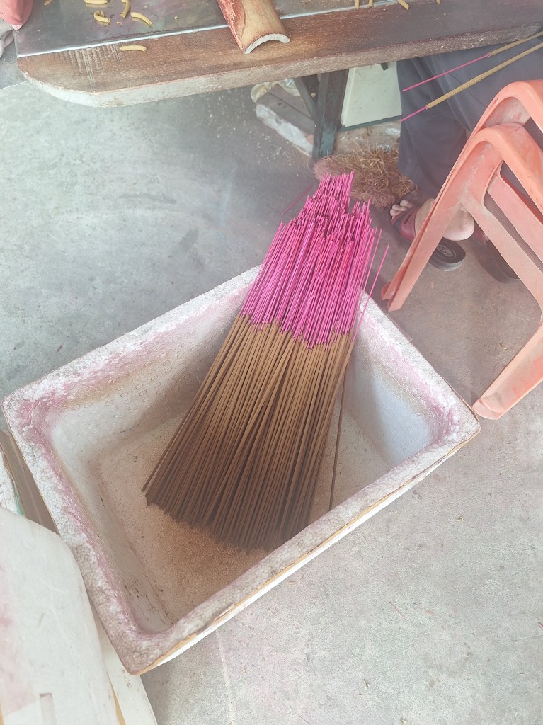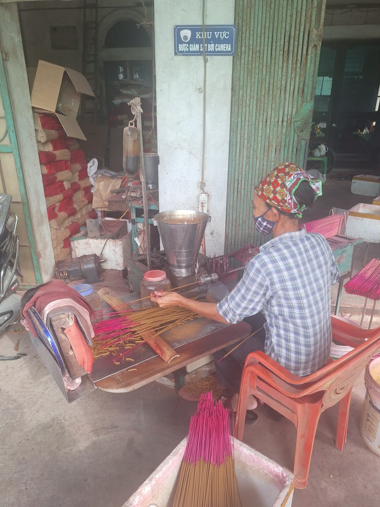 We visited many different families to see them working on different parts of the incense creation. It is a real skill, and some of these women can cut so fast and actuate with a machete.