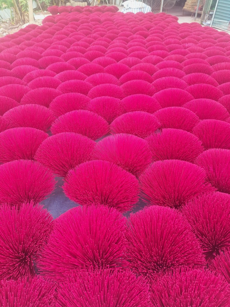 Once cut into the small sticks, we know incense to be either by hand or machine they then dye half the stick and leave in the sun to dry.