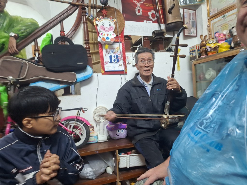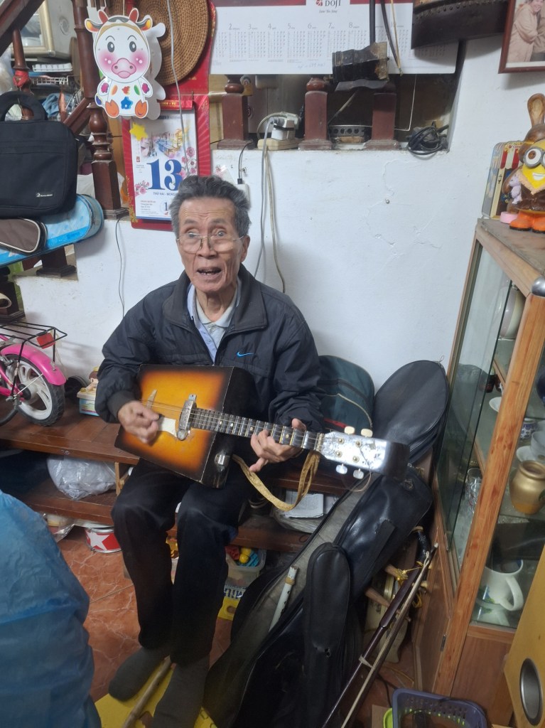 He looks after the great grand children and plays them instruments, he gave us a few demos on the different instruments he had next to him.