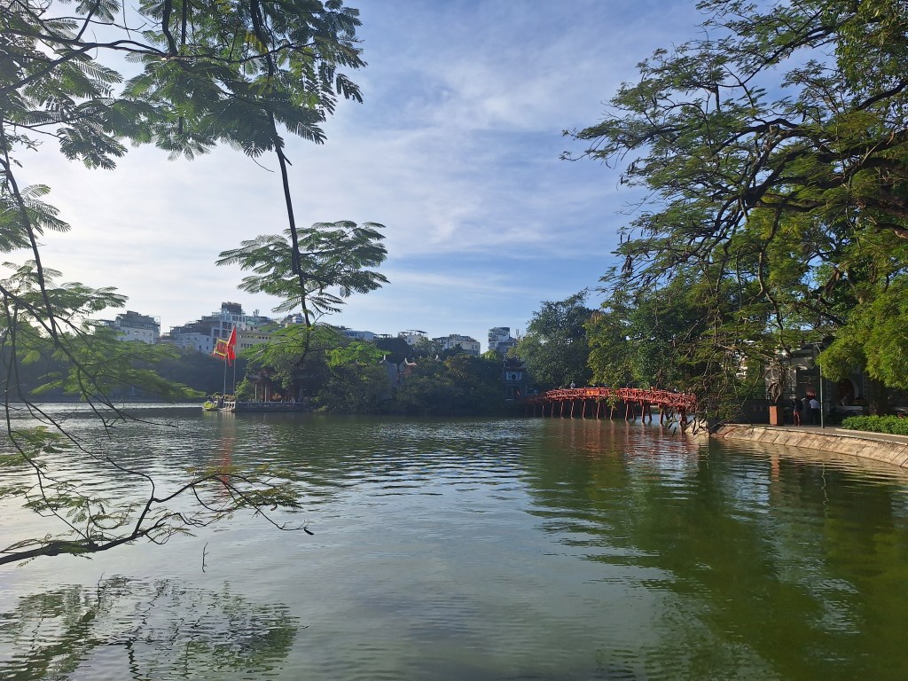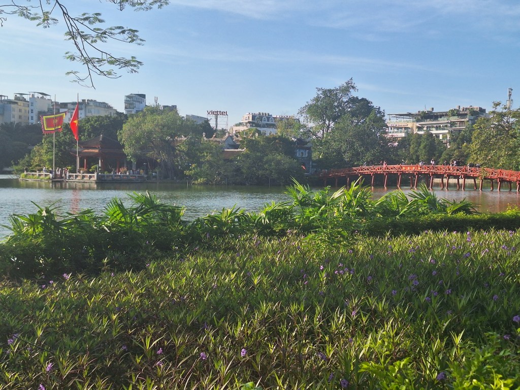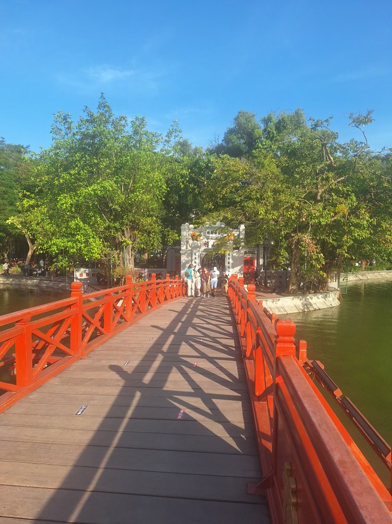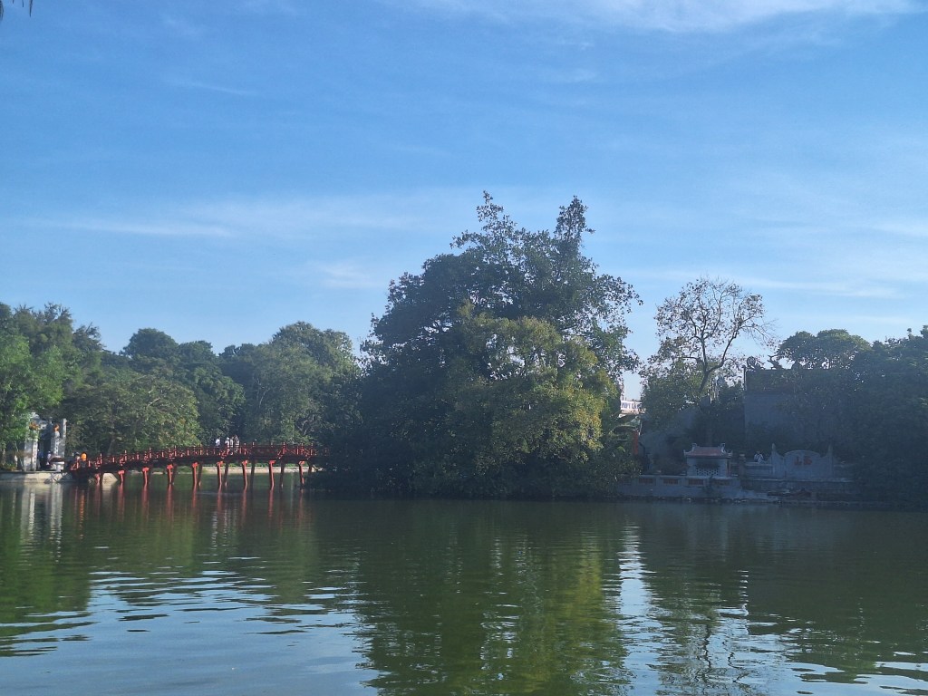 The Huc Bridge, also known as the “Red Bridge” is over 150 years old with the Ngoc Son Temple on the island it leads to.
