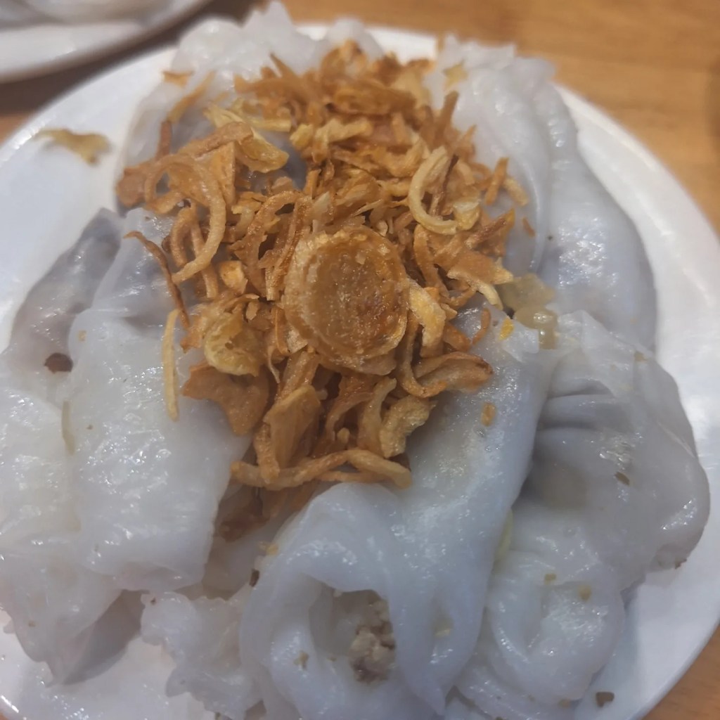 Bánh cuốn – Vietnamese steam rice, originating from Northern Vietnam. It is also a traditional breakfast as it’s not simple to make at home. Main ingredients include rice batter, ground pork, wood ear mushrooms, and fried shallots.