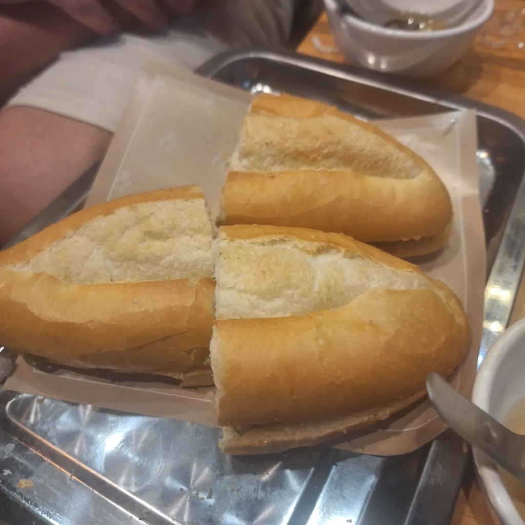Bánh mì is a short baguette, split lengthwise and filled with savoury ingredients, including bbq chicken and pork pate.
