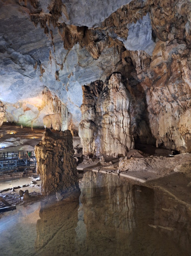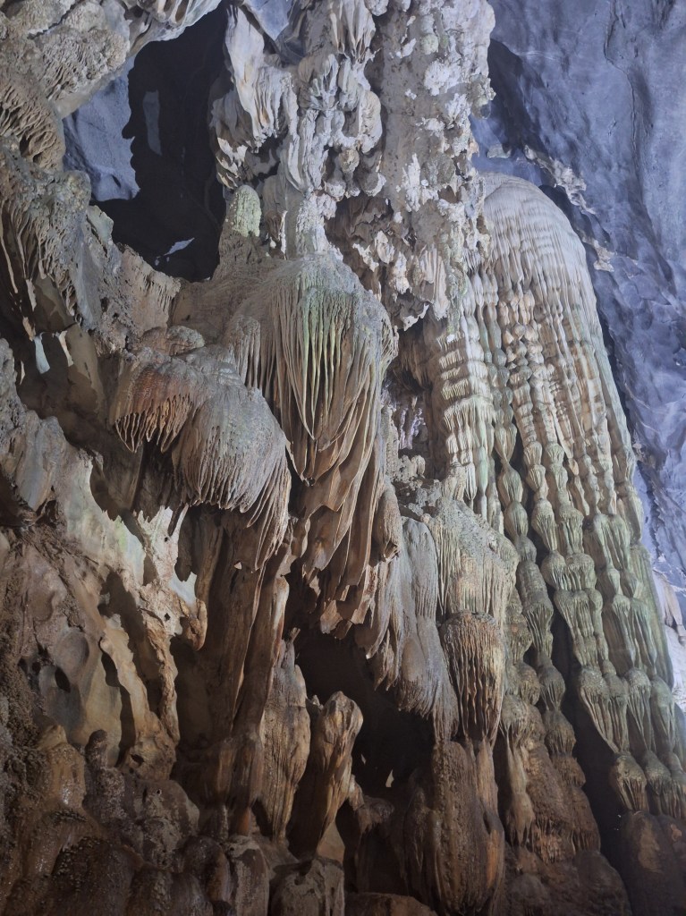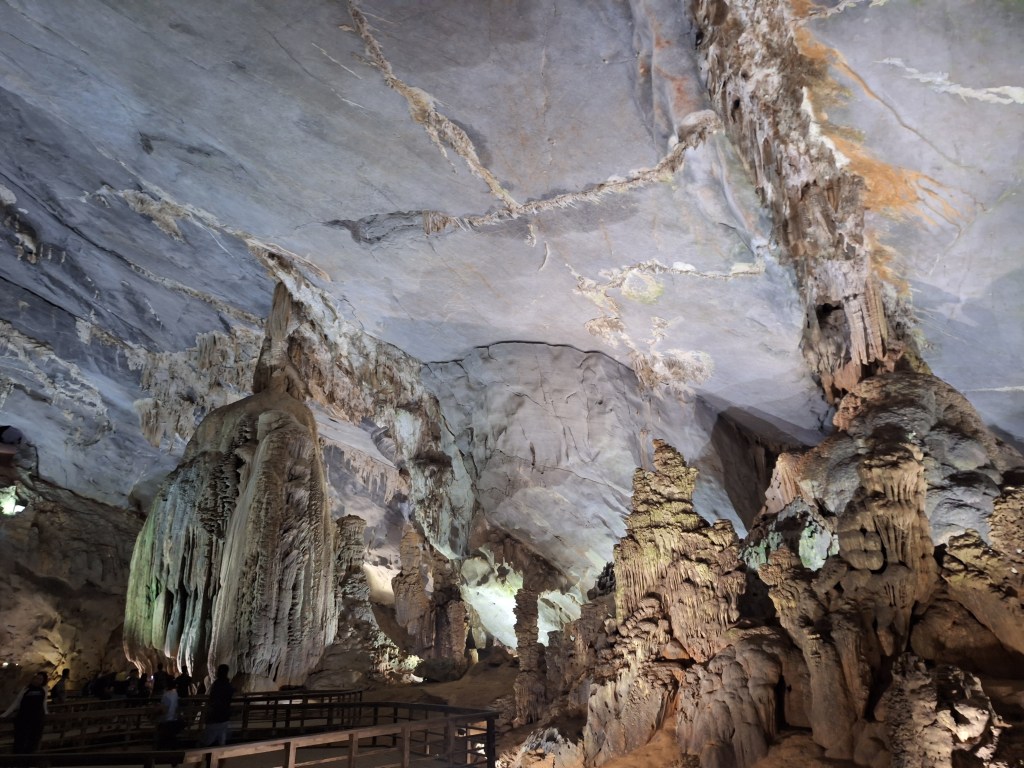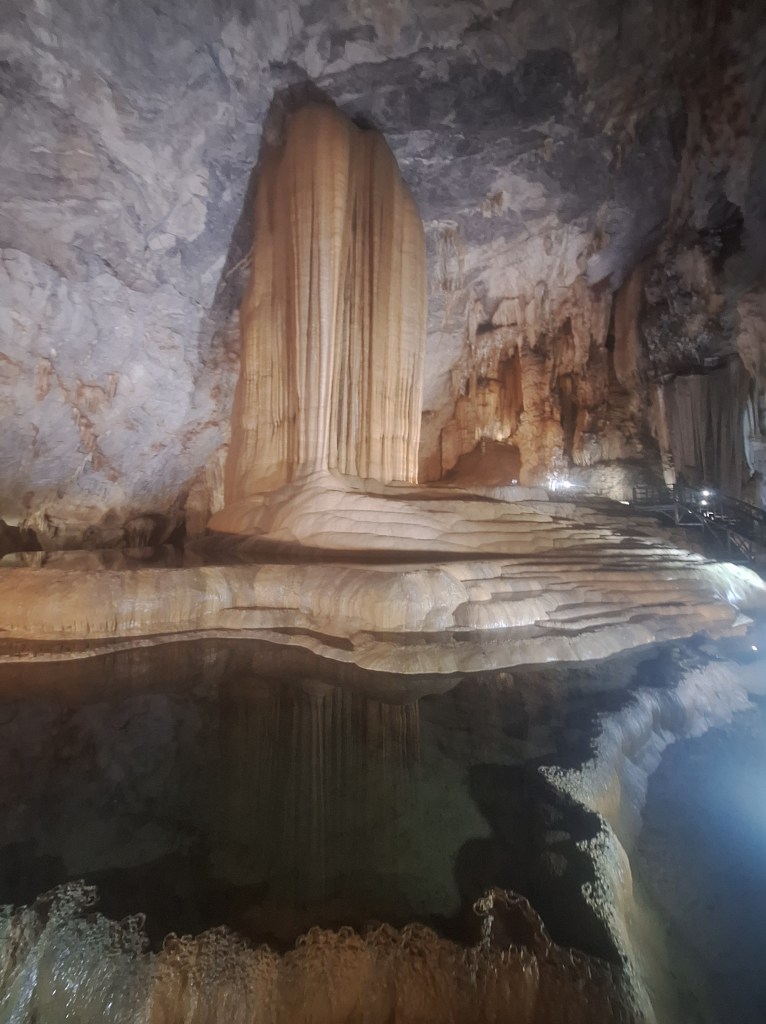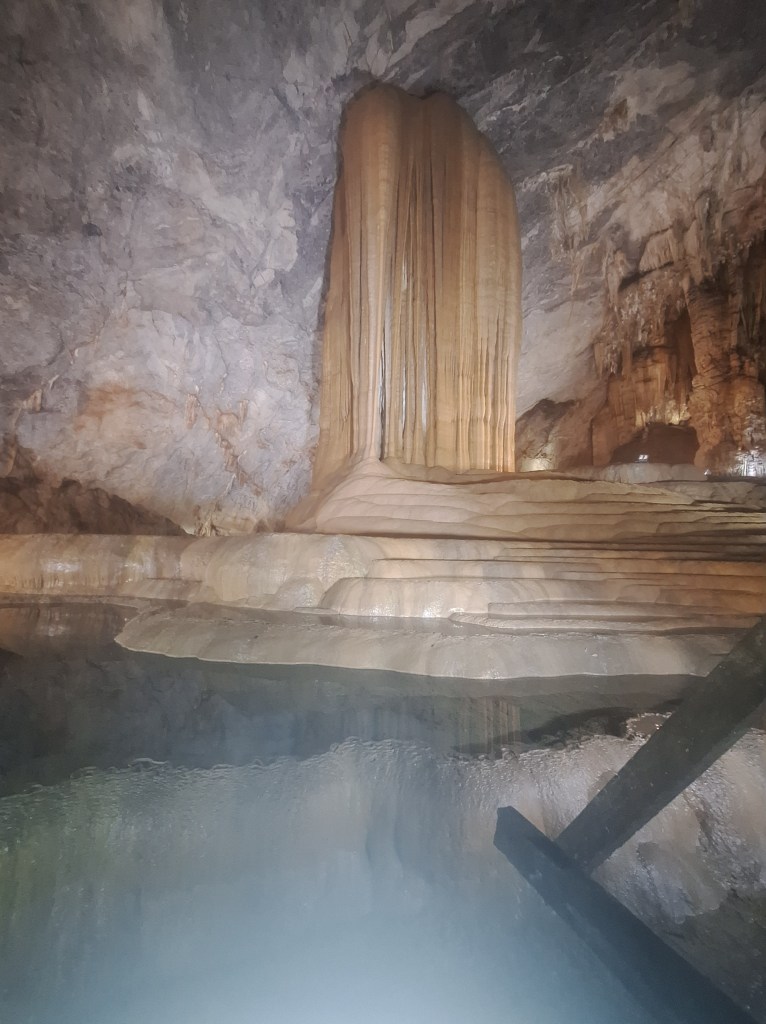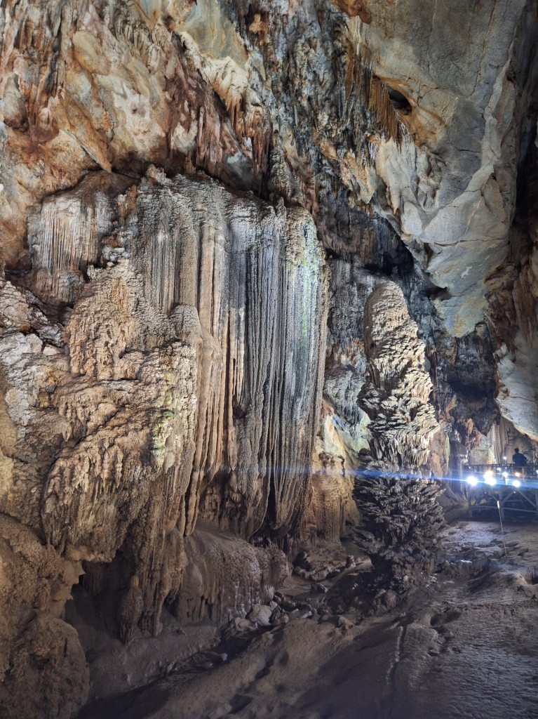 Paradise Cave is in the Phong Nha-Kẻ Bàng National Park. It was discovered by explorers from the British Cave Research Association in 2005 that found the cave and took 5 years to build the road and wooden platform. Its a limestone cave and 31km in length. They estimate it took 35-40 million years for the cave to form and a 1m of stalactites and stalagmites takes 1 million years to form.